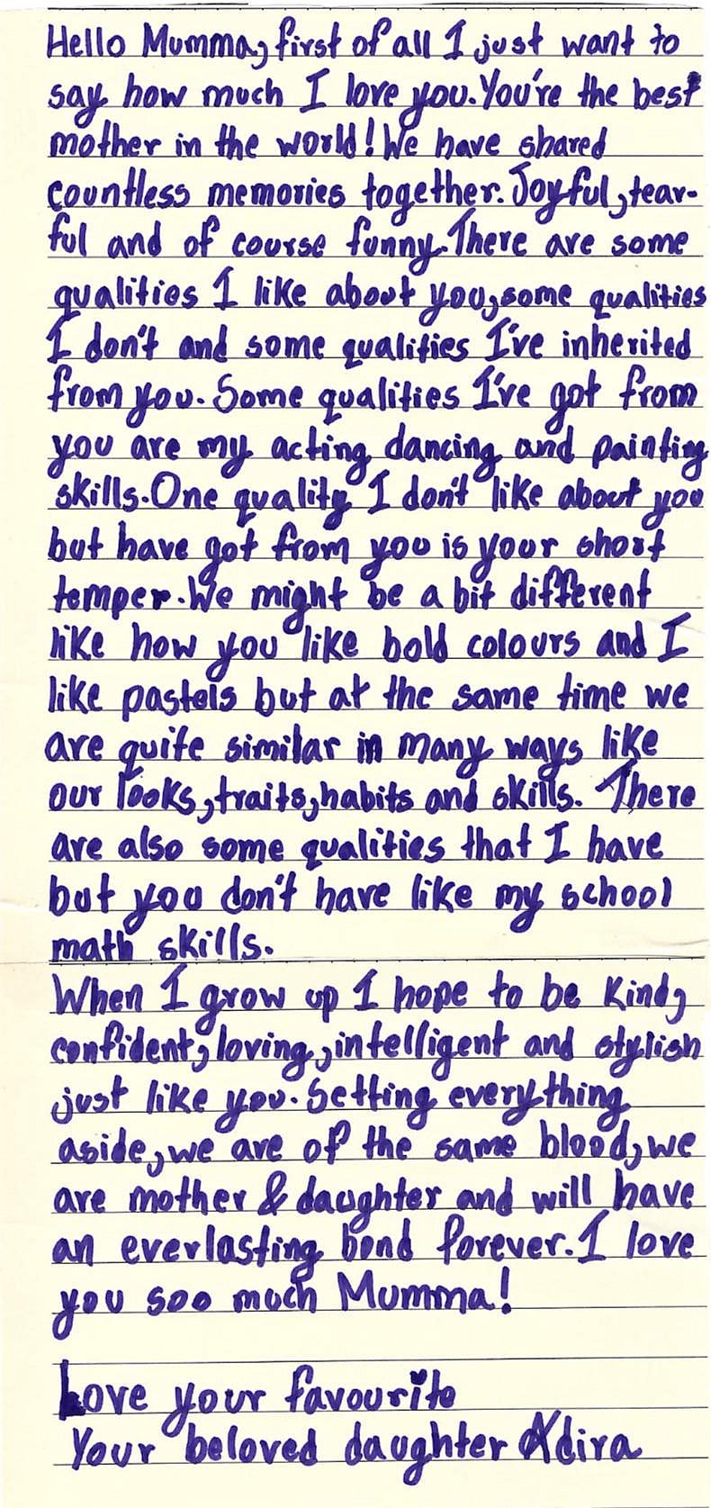 It further read, "Some qualities that I have got from you are my acting, dancing and painting skills. One quality I don't like about you but have got from you is your short temper. We might be a bit different, like how to like bod colours and I like pastels... but at the same time, we are quite similar in many ways - like our looks, habits and skills. There are also some I have that do don't have, like my school math skills. When I grow up, I want to be kind, confident, loving, intelligent and stylish, just like you."