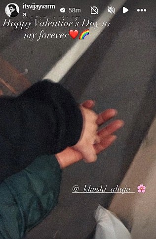 On Saturday, Vijay took to his Instagram story, where he was seen holding a woman’s hand, though her face was not visible. In the post, he wrote, "Happy Valentine’s Day to my forever," accompanied by a red heart and a rainbow emoji.