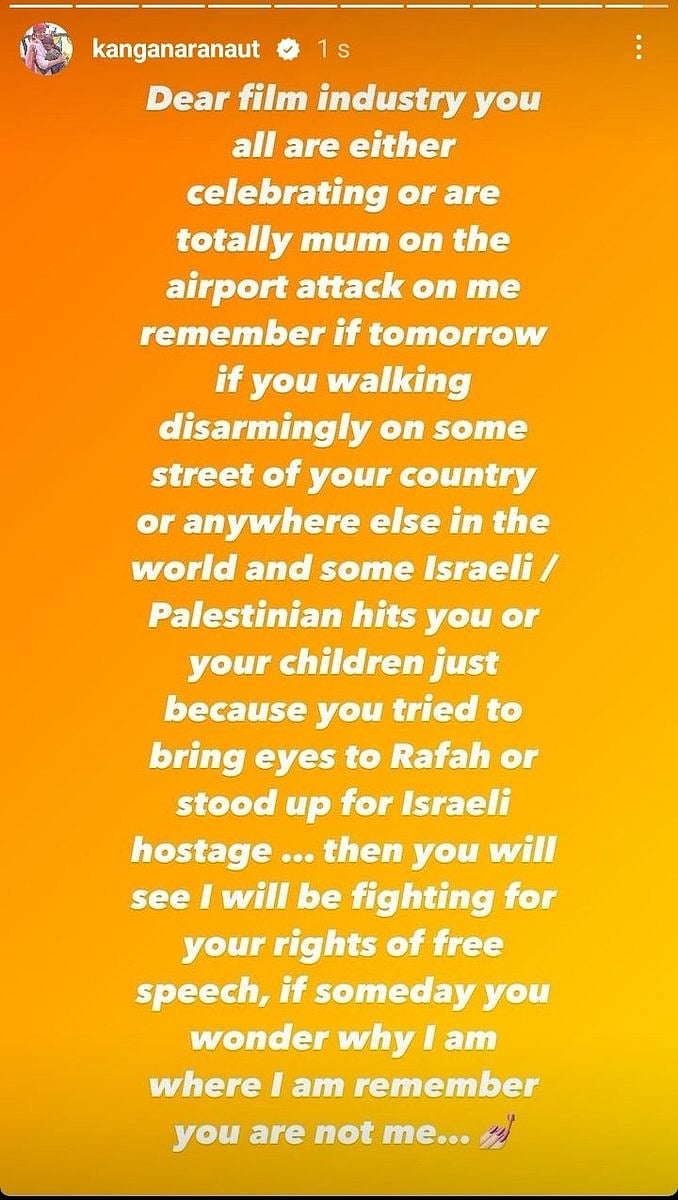 She wrote on her Instagram story, "Dear film industry you all are either celebrating or are totally mum on the airport attack on me. Remember, if tomorrow if you walk disarmingly on some street of your country or anywhere else in the world and some Israeli/Palestinian hots you or your children just because you tried to bring eyes to Rafah or stood up for Israeli hostage... then you will see I will be fighting for your rights of free speech , if someday you wonder why I am where I am, remember you are not me."