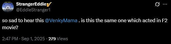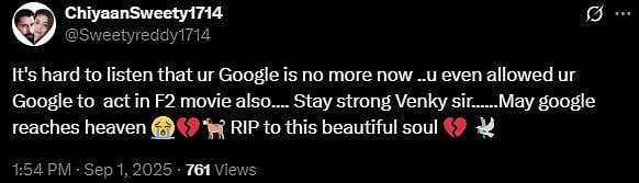 Another X user wrote, "So sad to hear this @VenkyMama. Is this the same one which acted in F2 movie? (sic)." One more netizen tweeted, "It's hard to listen that ur Google is no more now ..u even allowed ur Google to act in F2 movie also.... Stay strong Venky sir......May google reaches heaven RIP to this beautiful soul (sic)."
