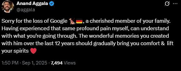 A netizen tweeted, "Sorry for the loss of Google, a cherished member of your family. Having experienced that same profound pain myself, can understand with what you're going through. The wonderful memories you created with him over the last 12 years should gradually bring you comfort & lift your spirits (sic)."