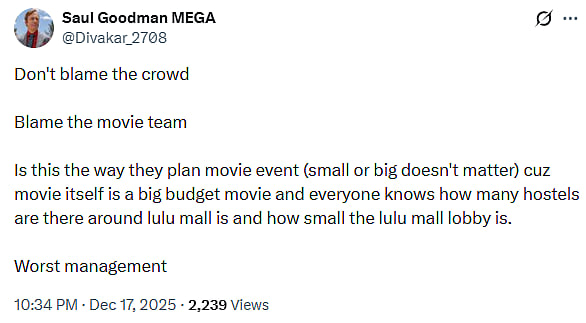 A netizen tweeted, "This is disturbing to watch. Celebrities deserve basic respect and personal space (sic)." Another X user wrote, "Don't blame the crowd. Blame the movie team. Is this the way they plan movie event (small or big doesn't matter) cuz movie itself is a big budget movie and everyone knows how many hostels are there around lulu mall is and how small the lulu mall lobby is. Worst management (sic)."