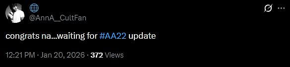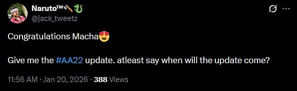Another fan wrote, "Congratulations! Give an #AA22 update on this occasion, bro! (sic)" One more netizen tweeted, "Congratulations Macha😍 Give me the #AA22 update. atleast say when will the update come? (sic)." Check out the tweets below...