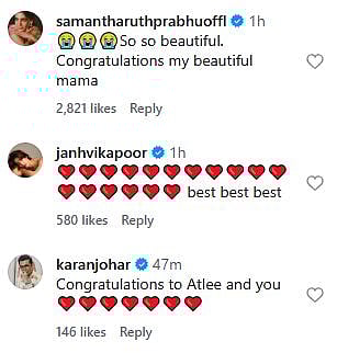 Karan Johar wrote, "Congratulations to Atlee and you (sic)." Wamiqa Gabbi, who worked with Atlee in Baby John commented, "Omg omg omg !!!! Congratulations you guysssssssssssss (sic)."