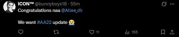 Amid the congratulations comments, Allu Arjun's fans on X (Twitter) are asking Atlee to give an update about #AA22. A fan tweeted, "Congratulations naa @Atlee_dir We want #AA22 update (sic)."
