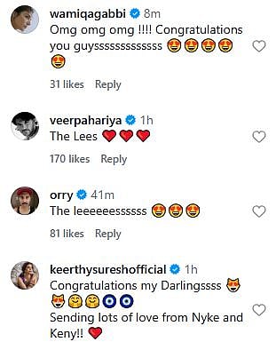 Keerthy Suresh, who was also a part of Baby John, wrote, "Congratulations my Darlingssss 😻😻🤗🤗🧿🧿 Sending lots of love from Nyke and Keny!! (sic)." Check out the comments below...
