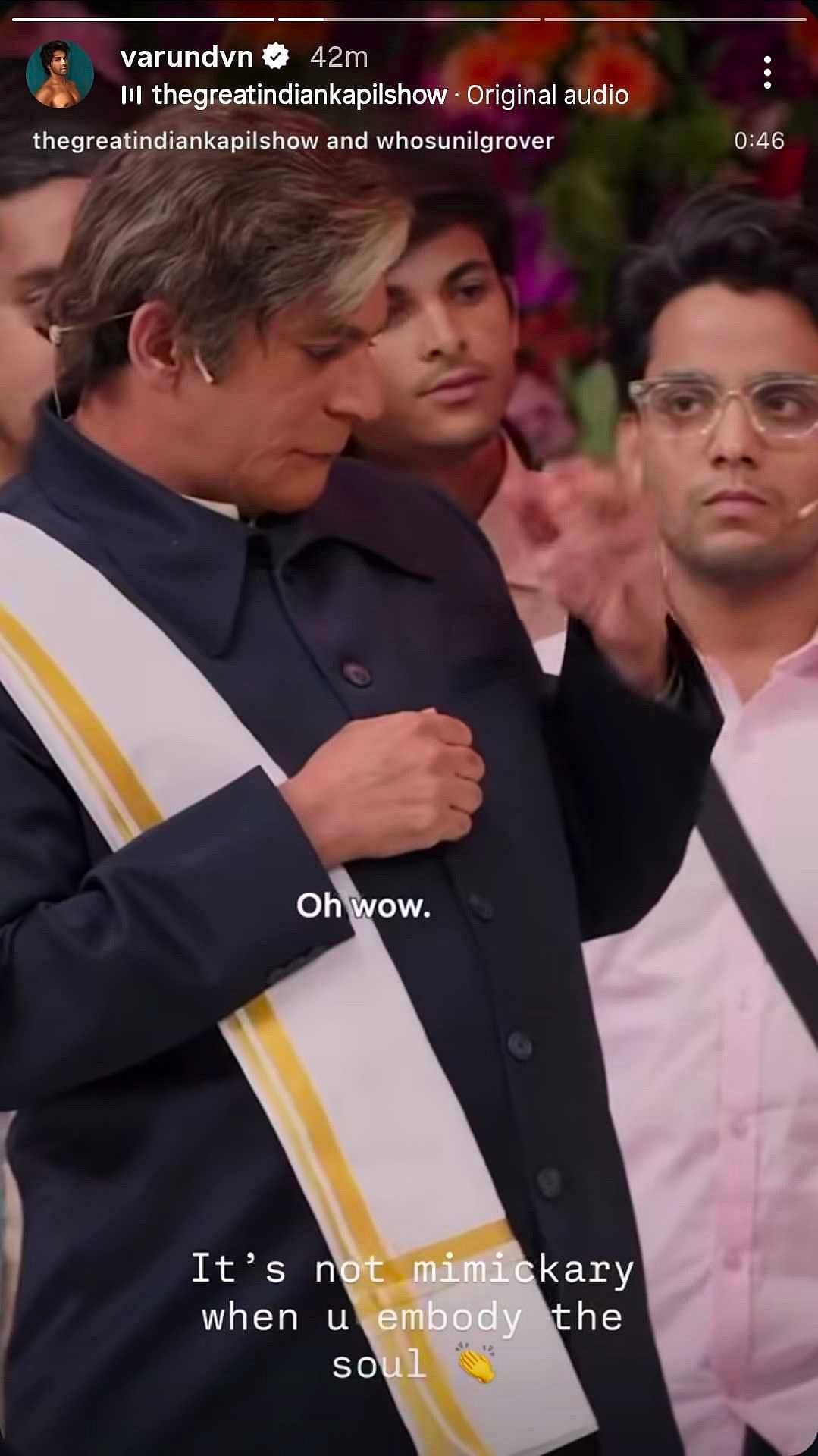 Varun Dhawan and his father, David Dhawan, will be seen as guests in the finale episode of The Great Indian Kapil Show season 4. A couple of promos of the episode have been shared on social media, in which we get to see Sunil as Kader Khan. He is so good that Varun took to Instagram story to praise him. The actor shared a promo of the episode and wrote, "It's not mimickary when you embody the soul (sic)." Check out Varun's post below...
