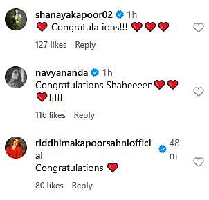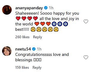 Ananya Panday commented, "Shaheeeeen! Soooo happy for you ❤️❤️❤️❤️ all the love and joy in the world ♥️♥️♥️🧿🧿🧿 best!!!!! (sic)." Neetu Kapoor showered blessings and wrote, "Congratulationsssss love and blessings (sic)." Check out the comments below...