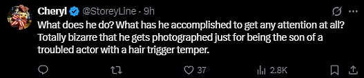 A user commented on X, "What does he do? What has he accomplished to get any attention at all? Totally bizarre that he gets photographed just for being the son of a troubled actor with a hair trigger temper."