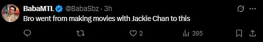 "Bro went from making movies with Jackie Chan to this," read another comment.