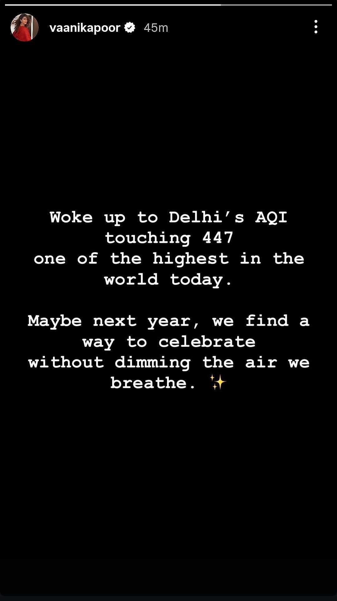 Vaani wrote, "Woke up to Delhi's AQI touching 447 one of the highest in the world today. Maybe next year, we find a way to celebrate without dimming the air we breathe (sic)."