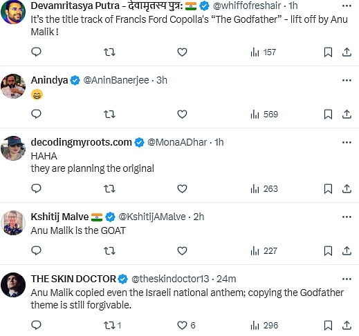 Another user said, "That was a rip off from GOD FATHER. Al Pacino was the main lead 😅" A third user added, "Anu Malik copied even the Israeli national anthem; copying the Godfather theme is still forgivable." "Because Anu Malik copied it," said a user on X.
