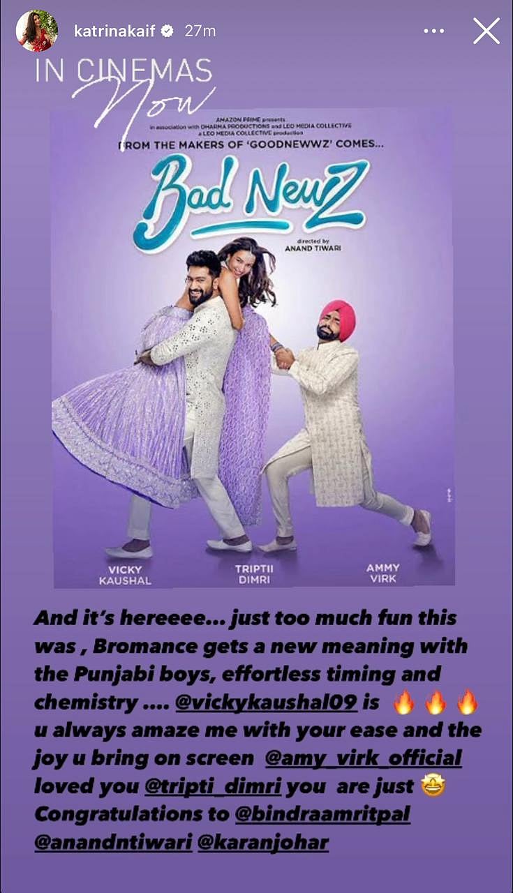 Katrina took to her Instagram story and wrote, “And it's hereeee... just too much fun this was, Bromance gets a new meaning with the Punjabi boys, effortless timing and chemistry.... @vickykaushal09 is 🔥🔥🔥 u always amaze me with your ease and the joy u bring on screen @amy_virk_official loved you @tripti_dimri you are just 🤩 Congratulations to @bindraamritpal @anandntiwari @karanjohar.”