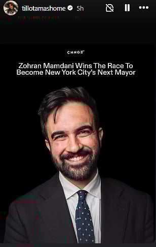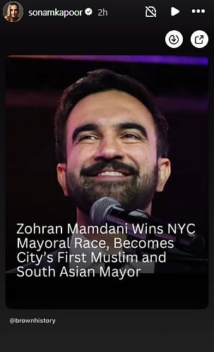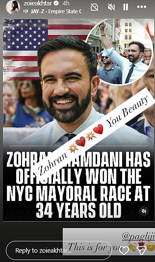Filmmaker Zoya Akhtar took to her Instagram story to share her excitement over Mamdani's election, writing, "Zohran. you beauty. @pagliji, this is for you."