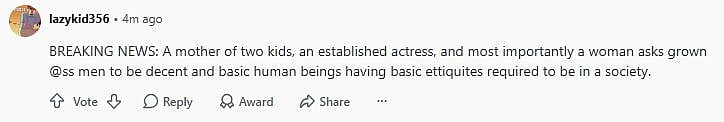 One more netizen commented, "BREAKING NEWS: A mother of two kids, an established actress, and most importantly a woman asks grown @ss men to be decent and basic human beings having basic ettiquites required to be in a society (sic)." Check out the comments below...