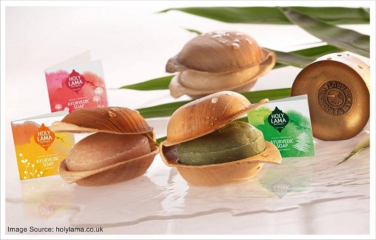A Kerala Government recognised women’s enterprise ‘Holy Lama’ makes long-lasting fragrances using super essential oils that are known to balance mind, body, and soul. The brand uses palm leaves from areca palm to create cases for their soaps.