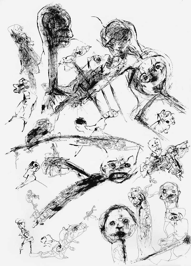 His black and white drawings are more like doodles, casual renderings of his village life, and a tribute to his father, as he used to watch him sketch.