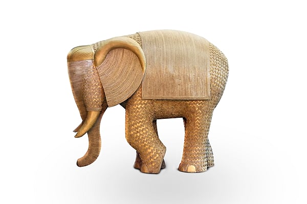 The ostentation of his garments evokes a royal charm. His attire was also created using corrugated cardboard sheets. The unconventionality of the medium infuses the stately beast with a grandeur that causes viewers to stare in awe.