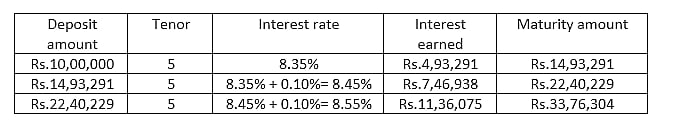 Moreover, investing in an FD doesn’t mean compromising on returns. Bajaj Finance offers competitive FD interest rates of up to 8.35% to regular customers and 8.70% to senior citizens when you take an FD for at least 3 years, with interest payable at maturity. By opting for this payout option, you can accumulate the amount you need comfortably. Here’s how: Assume that you invest Rs.10,00,000 for 3 consecutive terms of 5 years each. Each time you reinvest, you get an extra 0.10% interest.