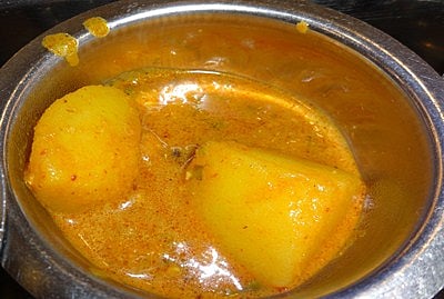 Peel the potatoes and cut them into cubes. Set aside chopped tomatoes. Heat oil in a pan. Add cumin seeds and when they pop add red chilli powder, haldi powder and cubed potatoes. Cook with 1 glass of water till almost done. Introduce tomatoes and cook till it becomes squishy. Add salt and chopped coriander leaves. Adjust water and let it boil. Serve hot with rotis.