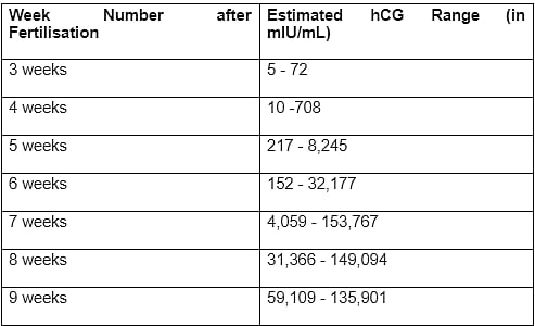 The hCG levels rise quickly during the first trimester of pregnancy and then decrease gradually after that. The pregnancy's length (week number) determines the estimated hCG ranges in pregnant women.