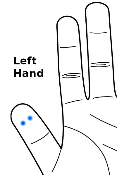 You can massage the highlighted area (see pic) or apply moong seeds on it with white surgical tape for Sujok Acupressure treatment. Do not tie the tape too tight. It should be tight enough to hold the seeds in one place. Moxa therapy can also be used, but with caution.