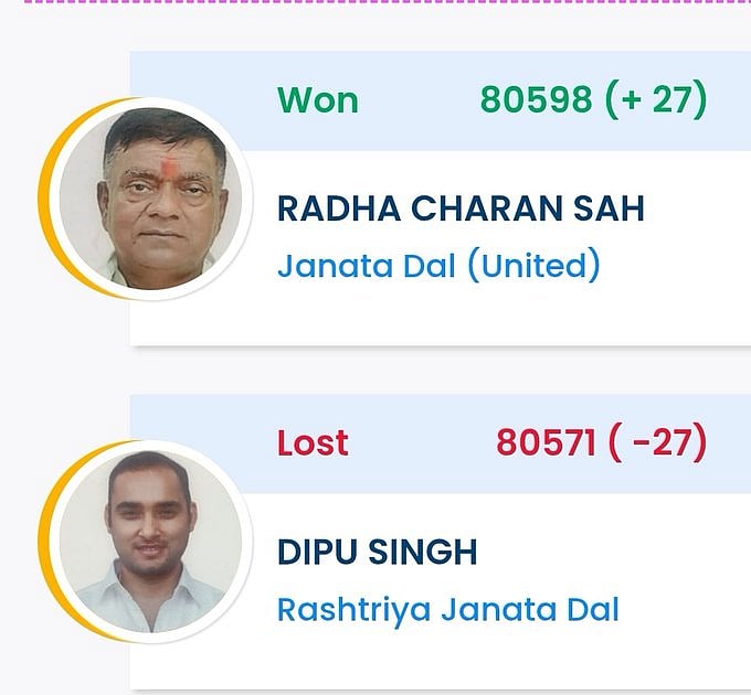 The most dramatic contest unfolded in Sandesh, where JDU’s Radha Charan Sah clinched victory over RJD’s Dipu Singh by only 27 votes, making it the tightest race of the 2025 Bihar Assembly elections. Sah secured 80,598 votes (43.99 per cent), barely edging out Singh, who finished with 80,571 votes (43.97 per cent). The wafer-thin difference made Sandesh the headline constituency in terms of electoral suspense.