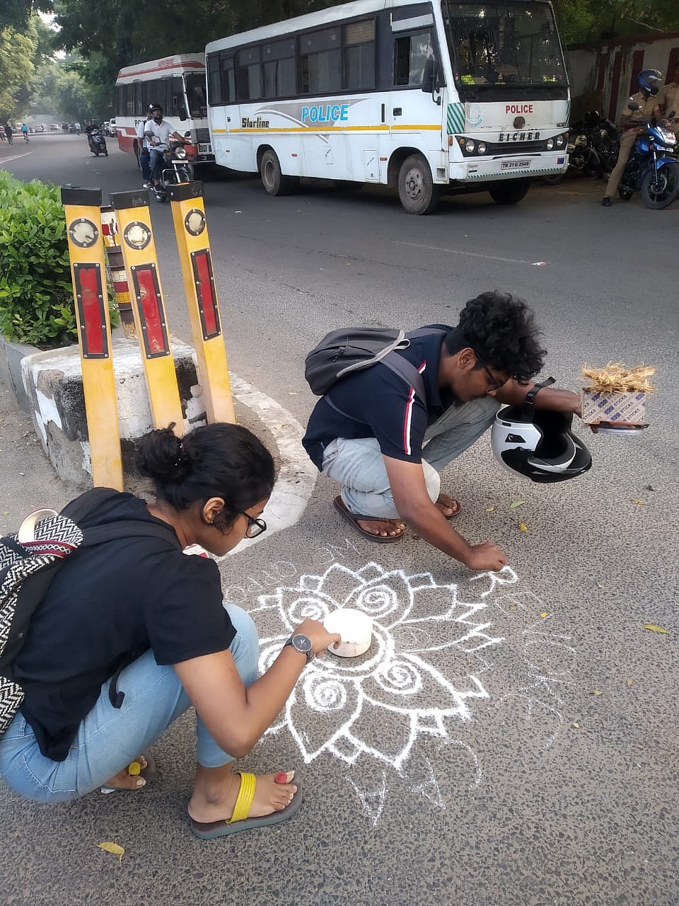 The protesters had informed the police of their 'unique' way of protest. However, the police had denied the permission. “Though there is nothing wrong in drawing ‘kolams’, they cannot do it and obstruct traffic. Hence we asked them to leave,” said a senior police officer told The Hindu.