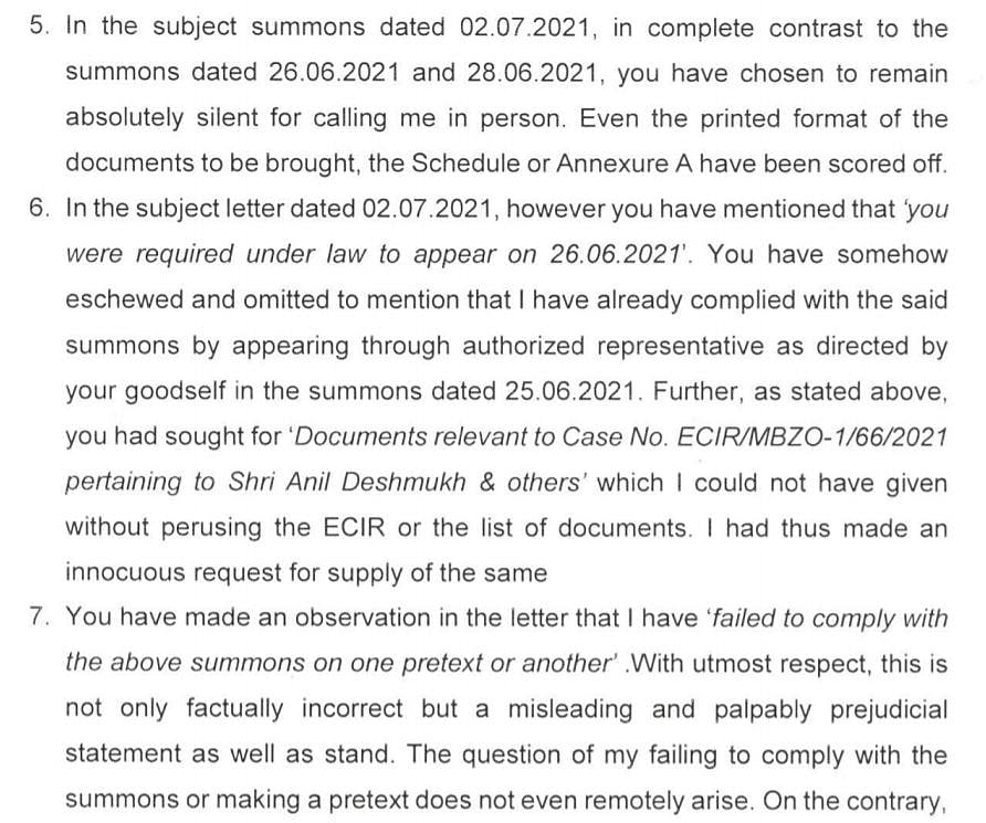 Deshmukh contends that his letter seeking details about the documents in question had so far gone unanswered. In a point by point format the former Home Minister also touched upon summons and interactions that had followed in the weeks after that. According to the response given by Deshmukh, there are several contradictions and misleading aspects to the ED's remarks in the case.