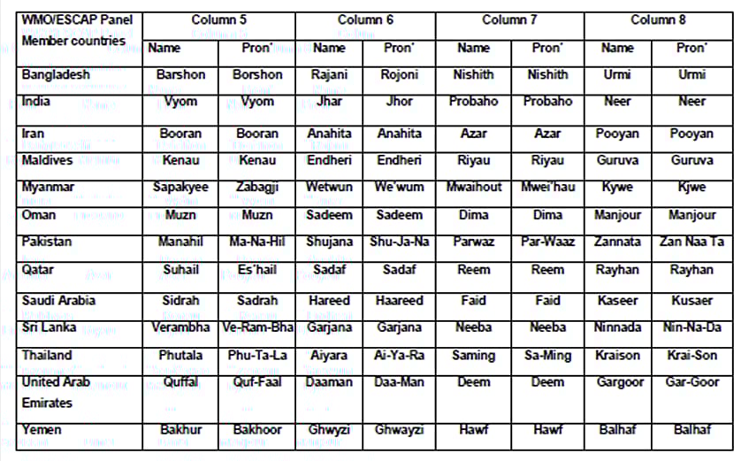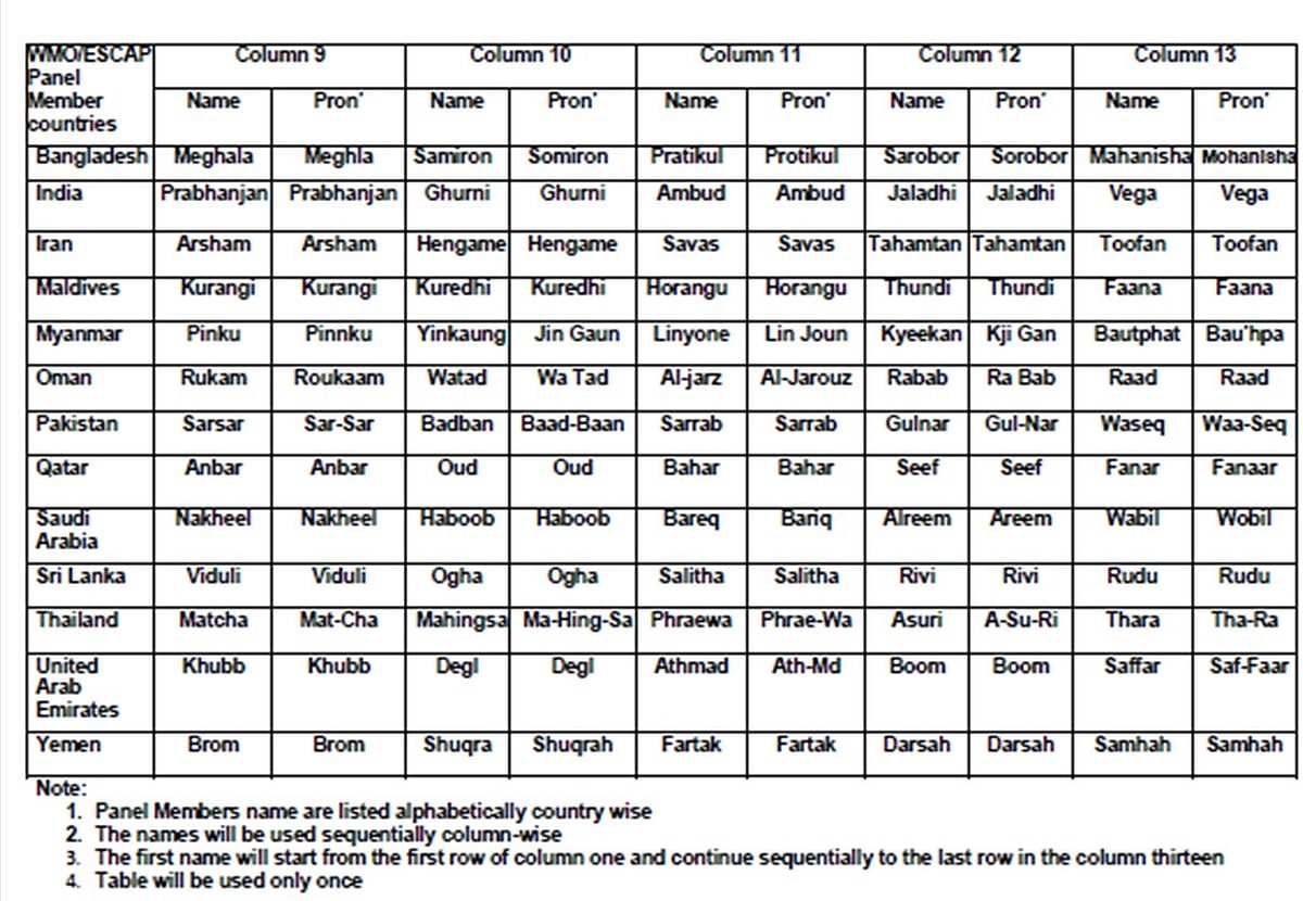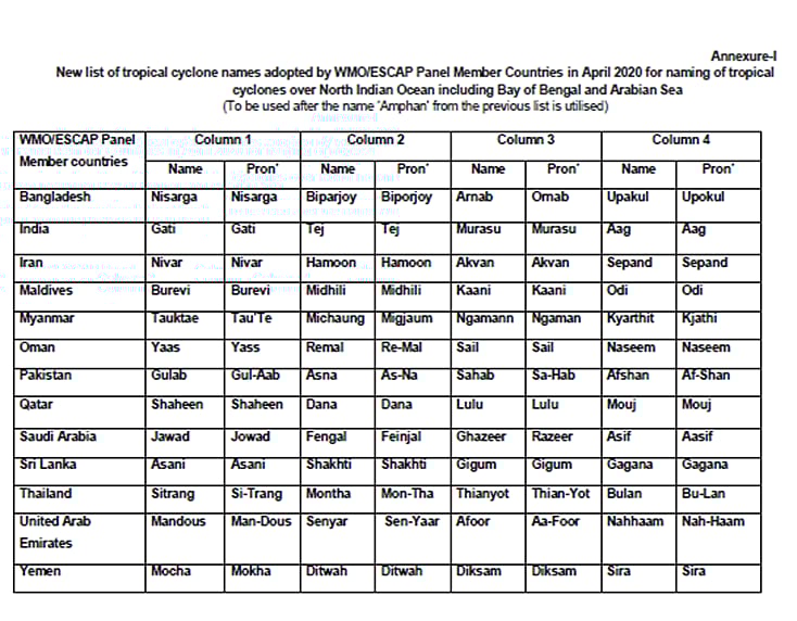 The list comprises names of 13 cyclones each for the 13 member countries, totaling to 169. The names for India include Gati, Tej, Murasu, Aag, Vyom, Jhar, Probaho, Neer, Prabhanjan, Ghurni, Ambud, Jaladhi and Vega.