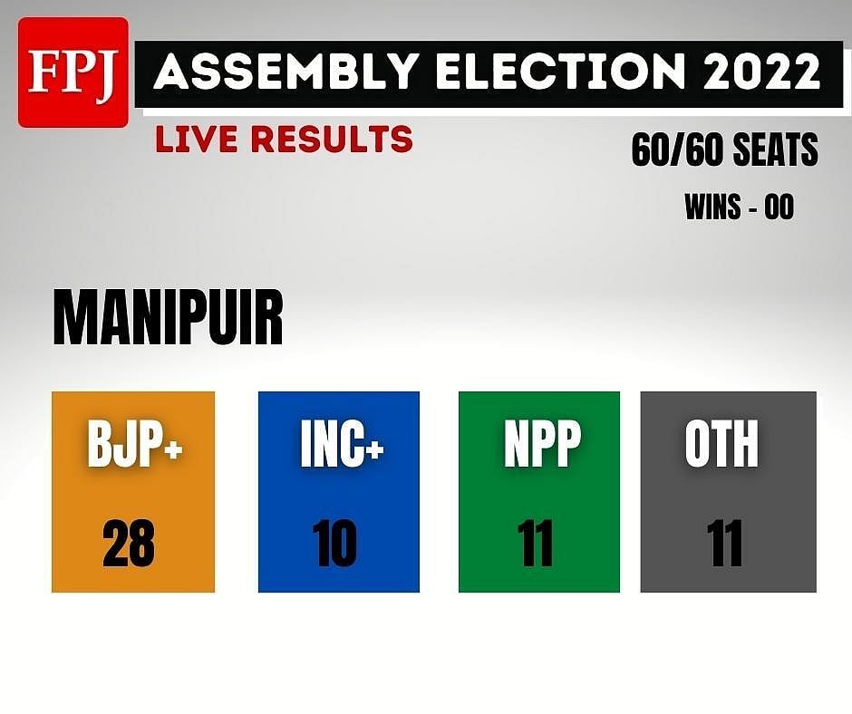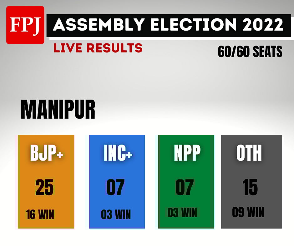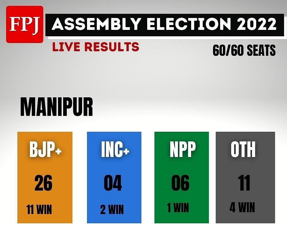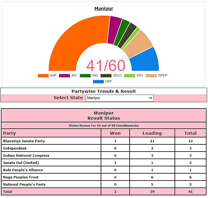 Manipur elections 2022: BJP wins 1 and leads on 21, JD(U) wins 1 and leads on 1 as per official EC trends. Counting continues.