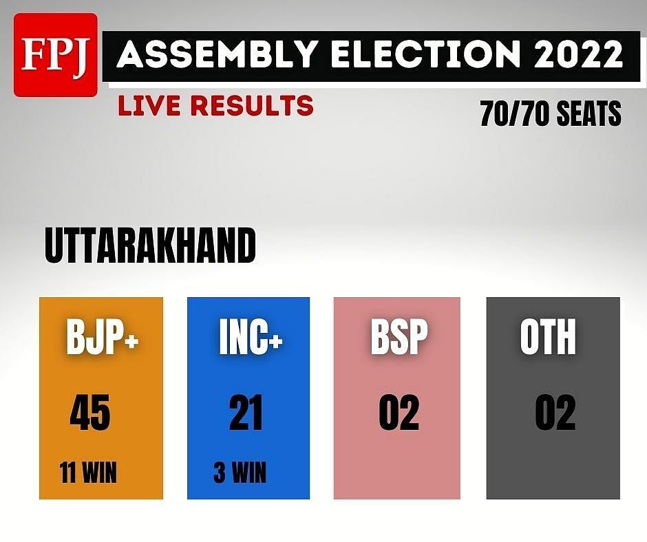 Uttarakhand (5 pm trends):ย BJP wins 20 & leads on 27, Congress wins 6 & leads on 13, BSP wins 1 & leads on another, Independent lead on 2.