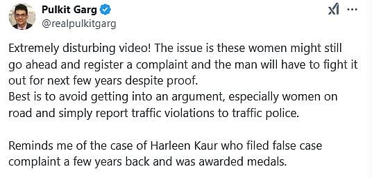 Advising others to take such matters to the traffic police rather than indulging with law violators, a user said, "Extremely disturbing video! The issue is that these women might still go ahead and register a complaint, and the man will have to fight it out for the next few years despite the proof. It’s best to avoid getting into an argument, especially with women on the road, and simply report traffic violations to the traffic police. This reminds me of the case of Harleen Kaur, who filed a false complaint a few years back and was awarded medals."