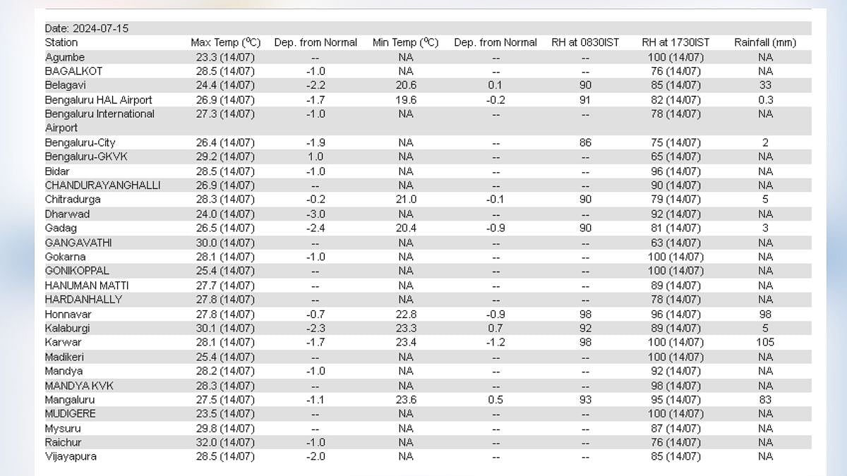 Local Weather Report and Forecast For: Bengaluru-City Dated :Jul 15, 2024 | IMD