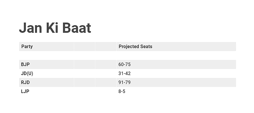 The Jan Ki Baat seat share projection for the Bihar Legislative Assembly Election 2020 has predicted 60-75 seats for the Bharatiya Janata Party (BJP), 31-42 seats for the Janata Dal (United) (JD-U), 91-79 seats for the Rashtriya Janata Dal (RJD), and 8-5 seats for the Lok Janshakti Party (LJP).