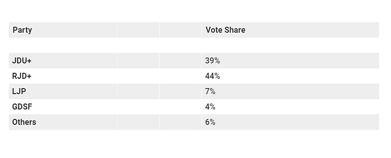 Lok Janshakti Party (LJP)'s Chirag Paswan and Rashtriya Lok Samta Party (RLSP)'s Upendra Kushwaha are behind with 7% and 4% of the electorate, respectively, favouring them.