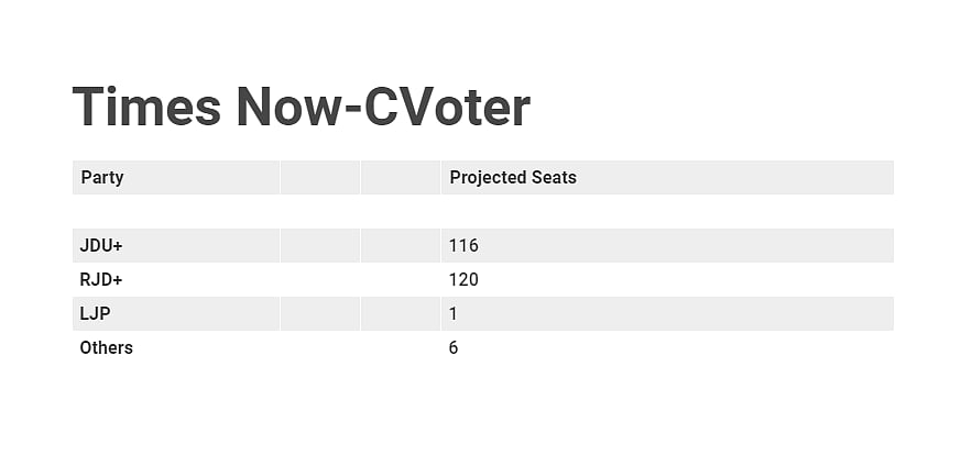 The Times Now-CVoter Exit Polls for the Bihar Legislative Assembly Election 2020 have predicted 116 seats for the National Democratic Alliance (NDA), 120 seats for the Mahagathbandhan (Grand Alliance), 1 seat for the Lok Janshakti Party (LJP), and 6 seats to other parties.