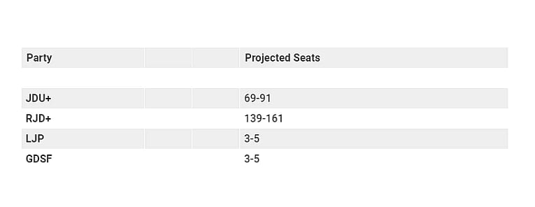 The India Today-Axis My India Exit Polls for the Bihar Legislative Assembly Election 2020 have predicted 69-91 seats for the National Democratic Alliance (NDA), 139-161 seats for the Mahagathbandhan (Grand Alliance), 3-5 seats for the Lok Janshakti Party (LJP), and 3-5 seats to other parties forming the Grand Democratic Secular Front (GDSF).