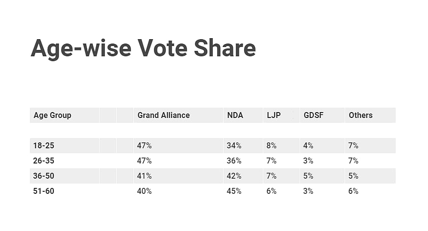 The India Today-Axis My India poll projections have thrown up some interesting projections in the age-wise vote share: the 18-35 age group, categorically the 'youth', has disproportionately favoured a change in the Chief Minister Nitish Kumar-led Janata Dal (United) (JD-U) regime, which is a part of the National Democratic Alliance (NDA).