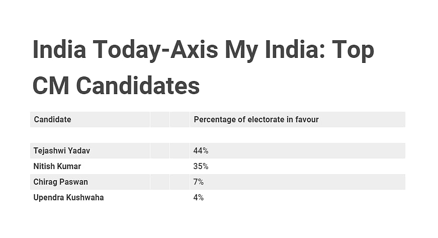 Tejashwvi Yadav is the preferred chief minister of Bihar according to India Today-My Axis exit poll prediction.