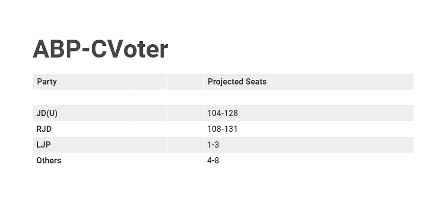 The ABP-CVoter Exit Polls for the Bihar Legislative Assembly Election 2020 have predicted 104-128 seats for the National Democratic Alliance (NDA), 108-131 seats for the Mahagathbandhan (Grand Alliance), 1-3 seat for the Lok Janshakti Party (LJP), and 4-8 seats to other parties.