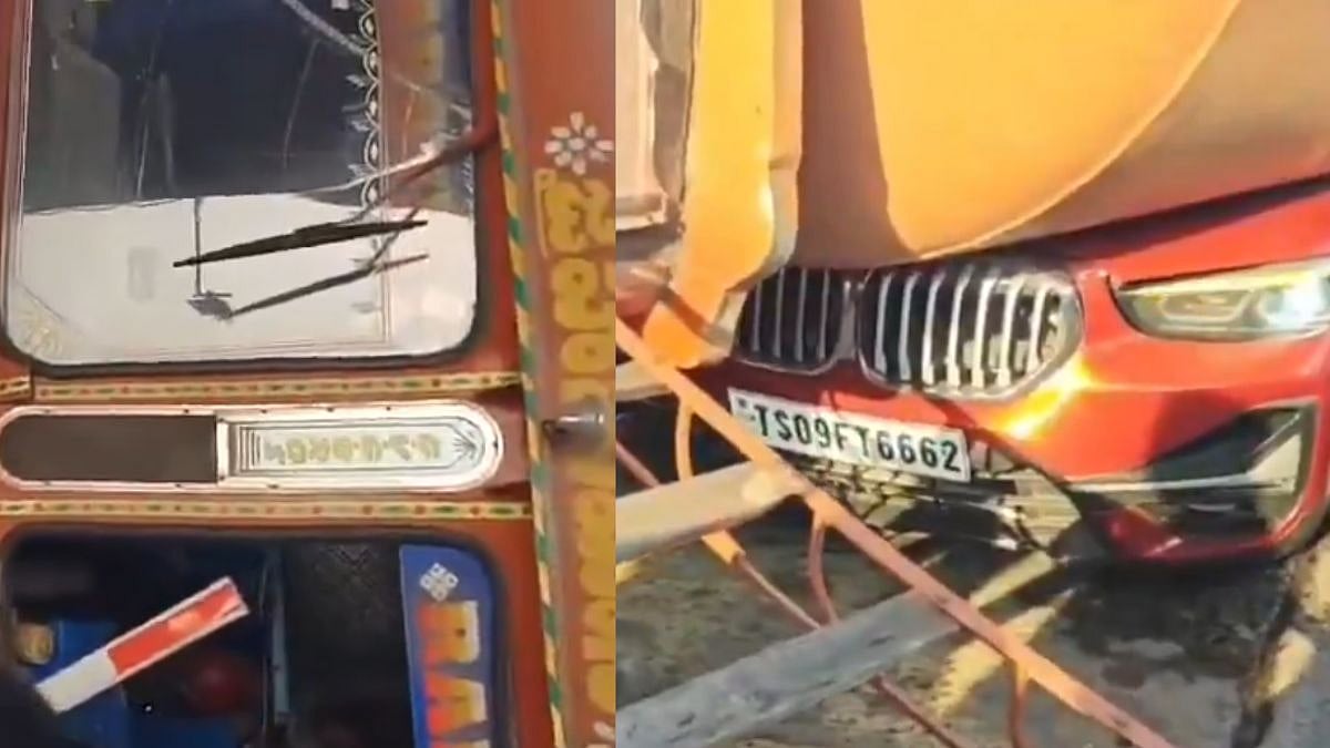 A concrete-laden truck overturned onto a BMW car at Keesara Toll Plaza in Kanchikacharla mandal on the Hyderabad–Vijayawada highway, completely crushing the luxury vehicle on Saturday. A senior lawyer, identified as Srinivas Rao, who was driving the car, was killed in the accident.