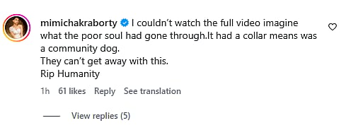 Actress and former Member of the Lok Sabha Mimi Chakraborty also commented on the post saying, "I couldn’t watch the full video imagine what the poor soul had gone through.It had a collar means was a community dog. They can’t get away with this. Rip Humanity."