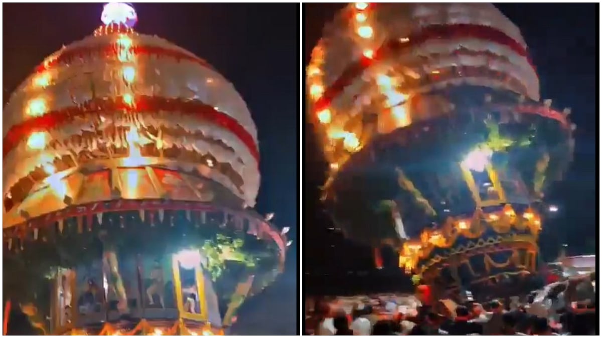 The incident caused panic among the pilgrims. In the video, it could be seen that the rope used to control the chariot snapped suddenly and the top portion of the chariot collapsed.