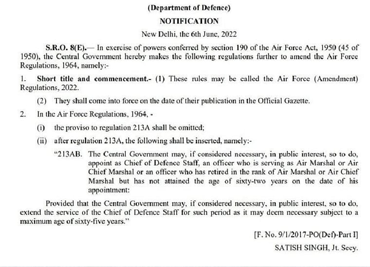 The notification further says that the government may extend the service of the Chief of Defence Staff for such a period as it may deem necessary, subject to a maximum age of 65 years.