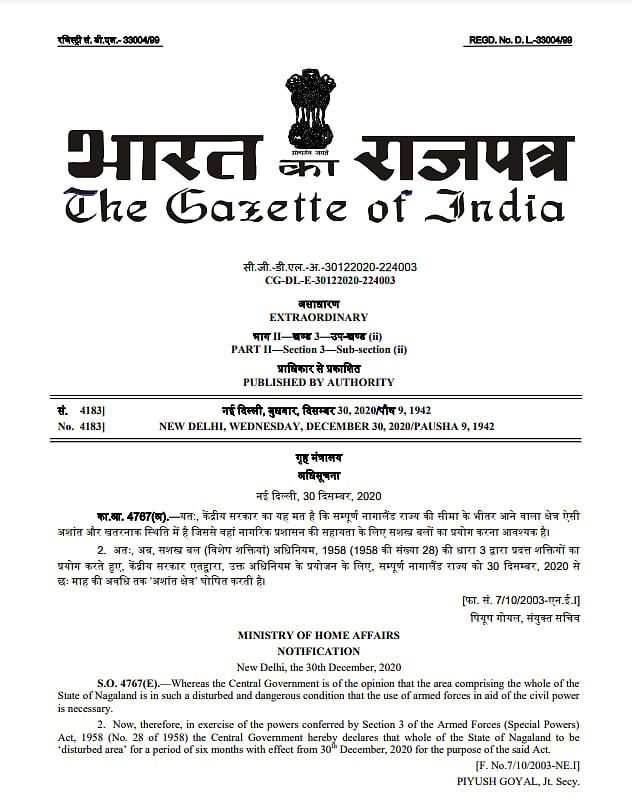 “Therefore, in exercise of the powers conferred by Section 3 of the Armed Forces (Special Powers) Act, 1958 (No 28 of 1958) the Central government hereby declares that whole of the State of Nagaland to be ‘disturbed area’ for a period of six months with effect from 30th December, 2020 for the purpose of the said Act,” the notification added.