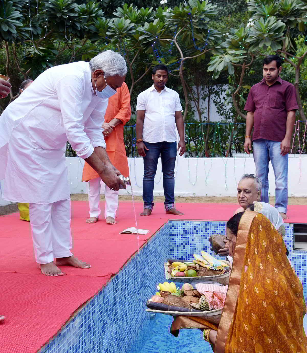 Bihar CM Nitish Kumar and Deputy CM Renu Devi offered prayers to the setting Sun on Friday evening. Nitish offered obeisance at the makeshift pond in his official bungalow at 1, Anney Marg. Nitish’s elder brother, elder sister-in-law and niece were observing the Chhath fest.