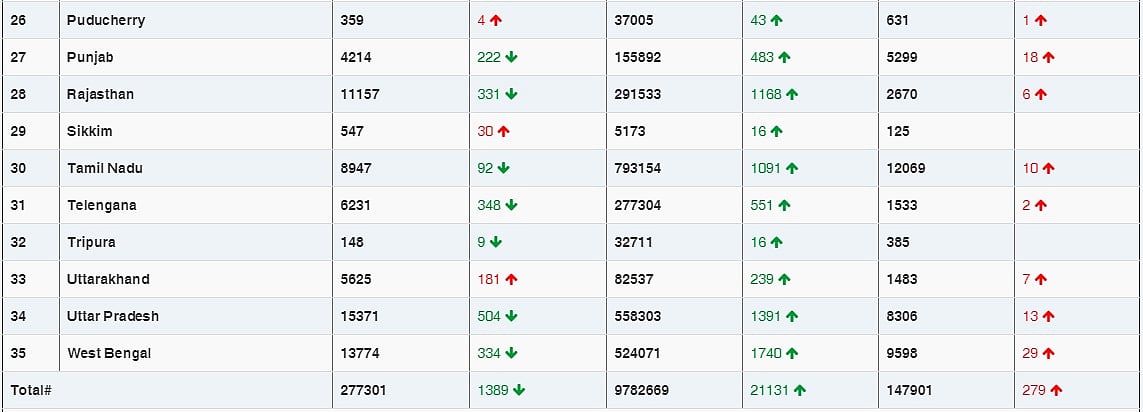The COVID-19 active caseload remained below 3 lakh for the seventh consecutive day. There are 2,77,301 active coronavirus infections in the country, which comprise 2.72 per cent of the total caseload, the data stated.