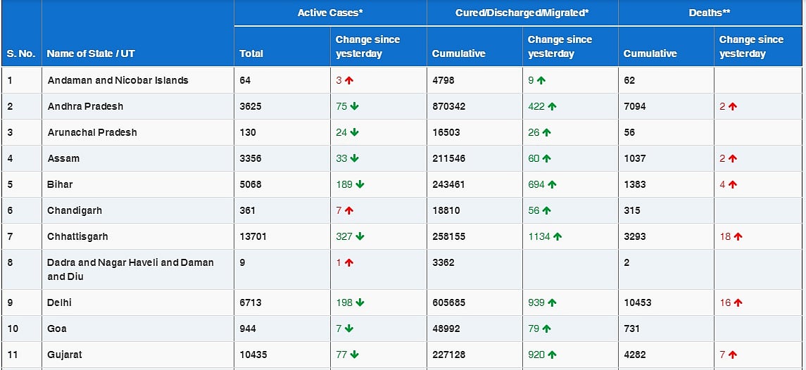 Here's state-wise data of active cases and deaths released by Union Ministry of Health and Family Welfare: