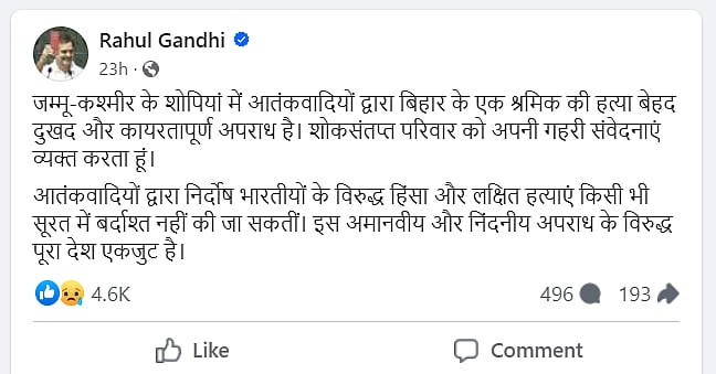 Reacting to the Shopian incident, Congress leader Rahul Gandhi also condemned the killing of non-local laborers. "The killing of a labourer from Bihar by terrorists in Shopian, Kashmir, is a very sad and cowardly criminal act. I express my deepest condolences to the bereaved family," Gandhi said in a statement posted on Facebook.